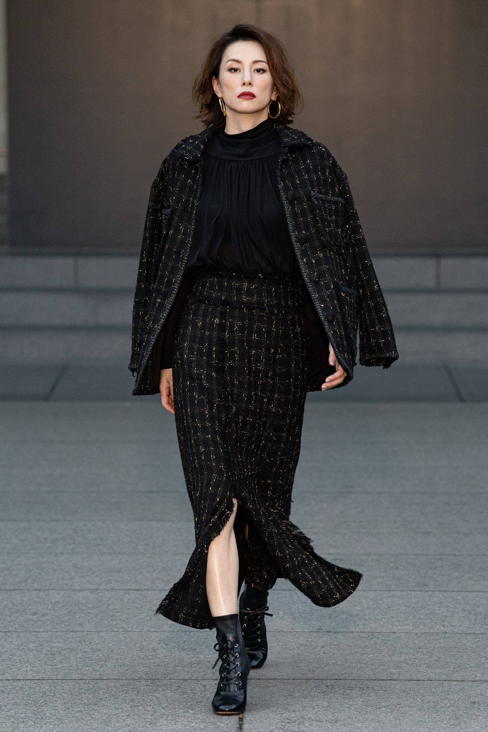 火热的酒红色三件套搭配起来相当到位,浓郁的酒红色针织套装搭配毛呢外套,耳朵上的大红色流苏耳环个性独特,大气洒脱的御姐风格特别适合她,阔腿裤和收腰设计非常完美。